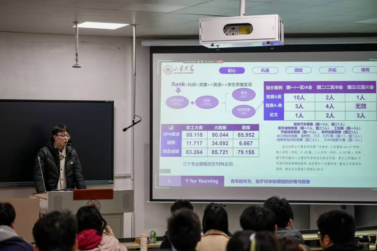 推免不是百米冲刺而是一场考验耐力的马拉松。高展学长着重介绍从大一到大四的大体规划方案、学校认可度较高的竞赛、三个专业的GPA规则。此外,高展学长还向同学们分享了自己大学期间参与的各种志愿与社会实践活动,鼓励同学们多去参加,不仅仅是在综测上为自己锦上添花,更是为自己的大学生涯添加一抹绚丽的色彩。同学们听得十分认真并深表认同。