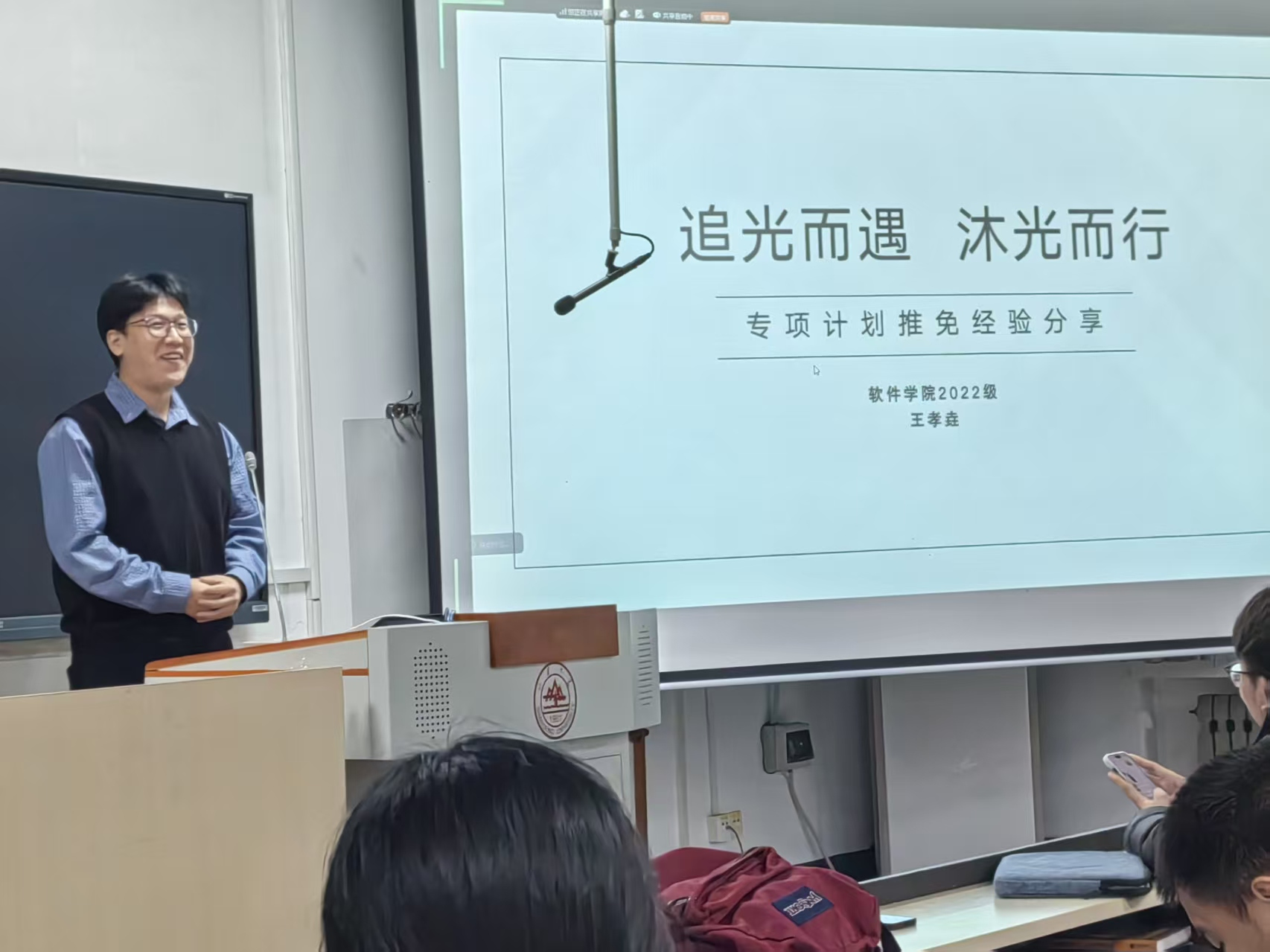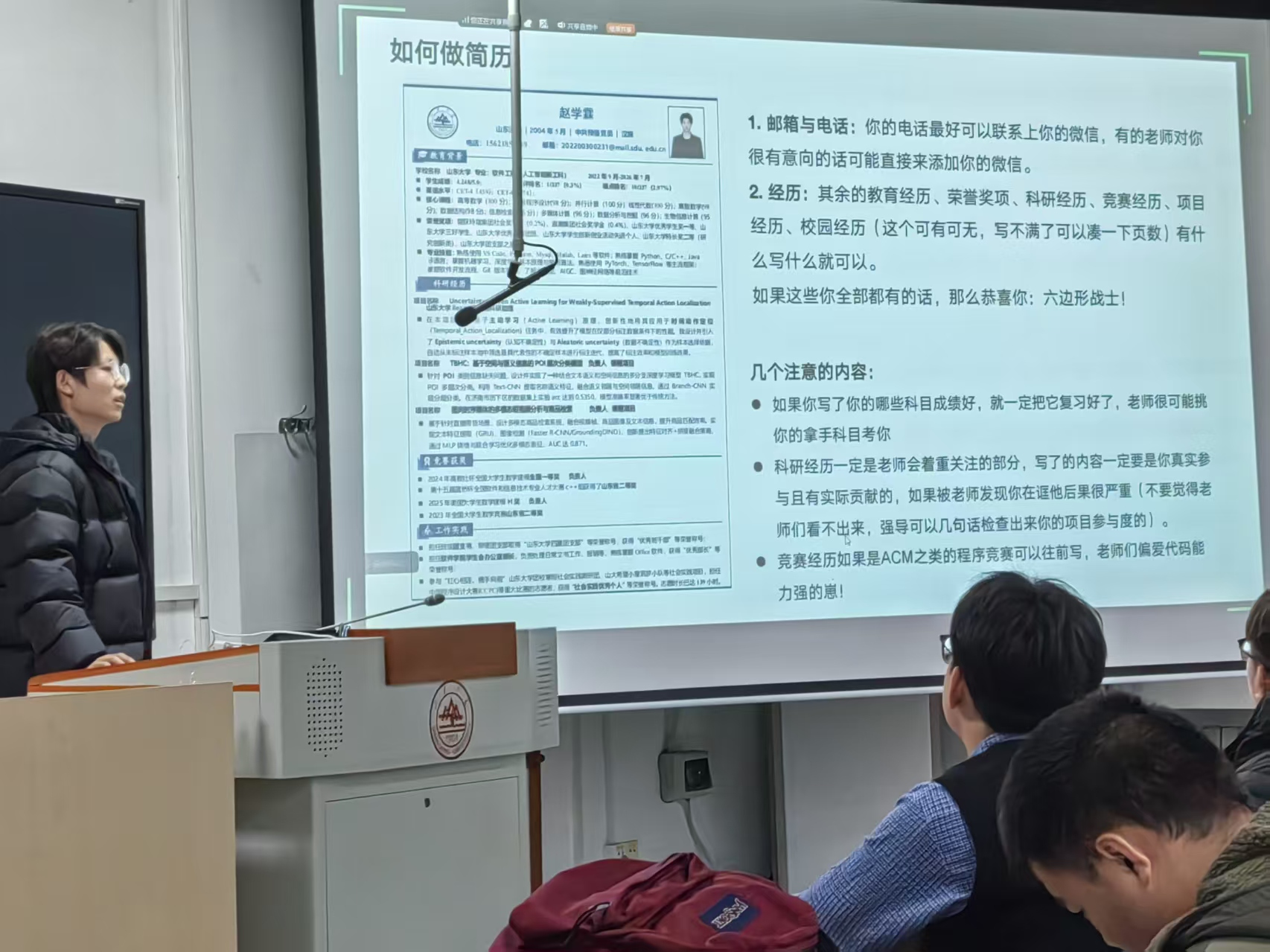 赵学霖学长在讲话中对推免流程进行了详细的介绍,包括推免流程,简历制作要点以及学科复习注意事项。赵学霖学长还分享了自己面试和机试的相关经验,相关信息的获取渠道(绿群,小红书等),告诉同学们推免是运气和实力的综合体现,建议同学们多报,多面,不要害怕被拒,要保持一个良好的心态。同学们都受益匪浅。