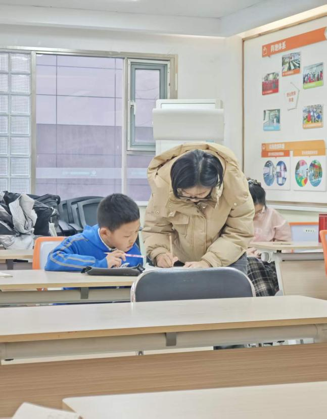 活动期间,志愿者们每天提前到岗,了解每位学生当天的学习安排与薄弱知识点,做到辅导有针对性、支持有温度。自习过程中,孩子们或专注书写语文生字,或凝神思考数学题目,或轻声朗读英语课文。每当遇到难题,他们便会举手示意,志愿者随即上前,通过启发式提问和步骤分解,引导孩子自主寻找答案,逐步建立解题信心。