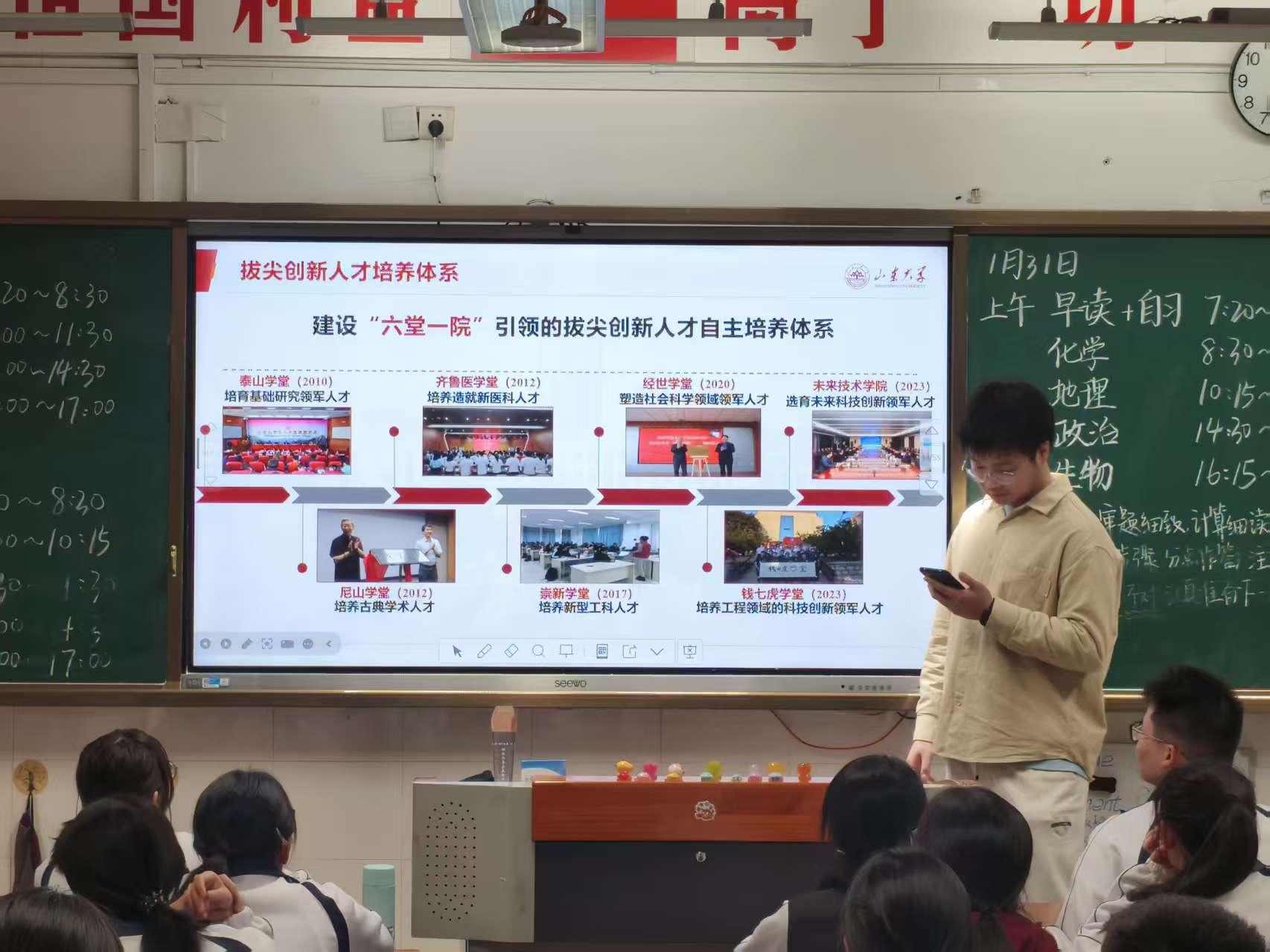 冬寒未褪,暖意先行;薪火相传,逐梦同行。为回馈母校培育之恩,传递山东大学的办学理念与育人温度,帮助晋江一中高三学子明晰高考方向、规划生涯路径,2月1日晚,山东大学多名晋江籍学子重返母校晋江一中,积极参与“向母校汇报”高校宣讲活动,以山大学子的责任与担当,为学弟学妹们送上备考干货与青春指引,续写母校与山大的温暖羁绊。作为山东大学物理学院的一名学子,鲤跃泉城宣讲队成员林鸿滨有幸与其他学长学姐并肩,以宣讲为桥,连接母校情谊,传递山大力量。
