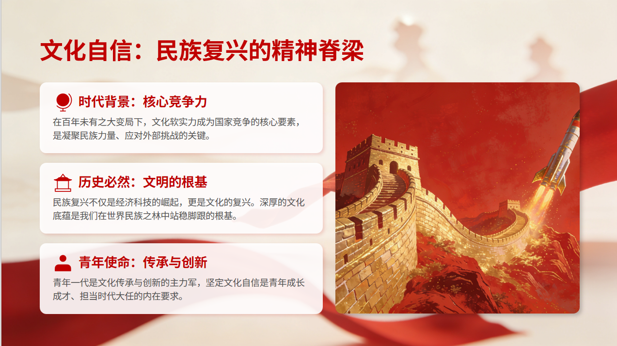 宣讲会以 “为何要增强文化自信” 为开篇,指出文化自信是民族复兴的精神脊梁,在百年未有之大变局下,文化软实力已成为国家核心竞争力,而青年作为文化传承主力军,坚定文化自信是成长成才的内在要求。随后,宣讲对社会主义先进文化进行系统解读,明确其以马克思主义为指导、以社会主义核心价值观为引领的核心定义,阐释了科学性、时代性、民族性、开放性、群众性五大特征,并剖析了中华优秀传统文化、革命文化、社会主义先进文化 “三位一体” 的有机统一关系。