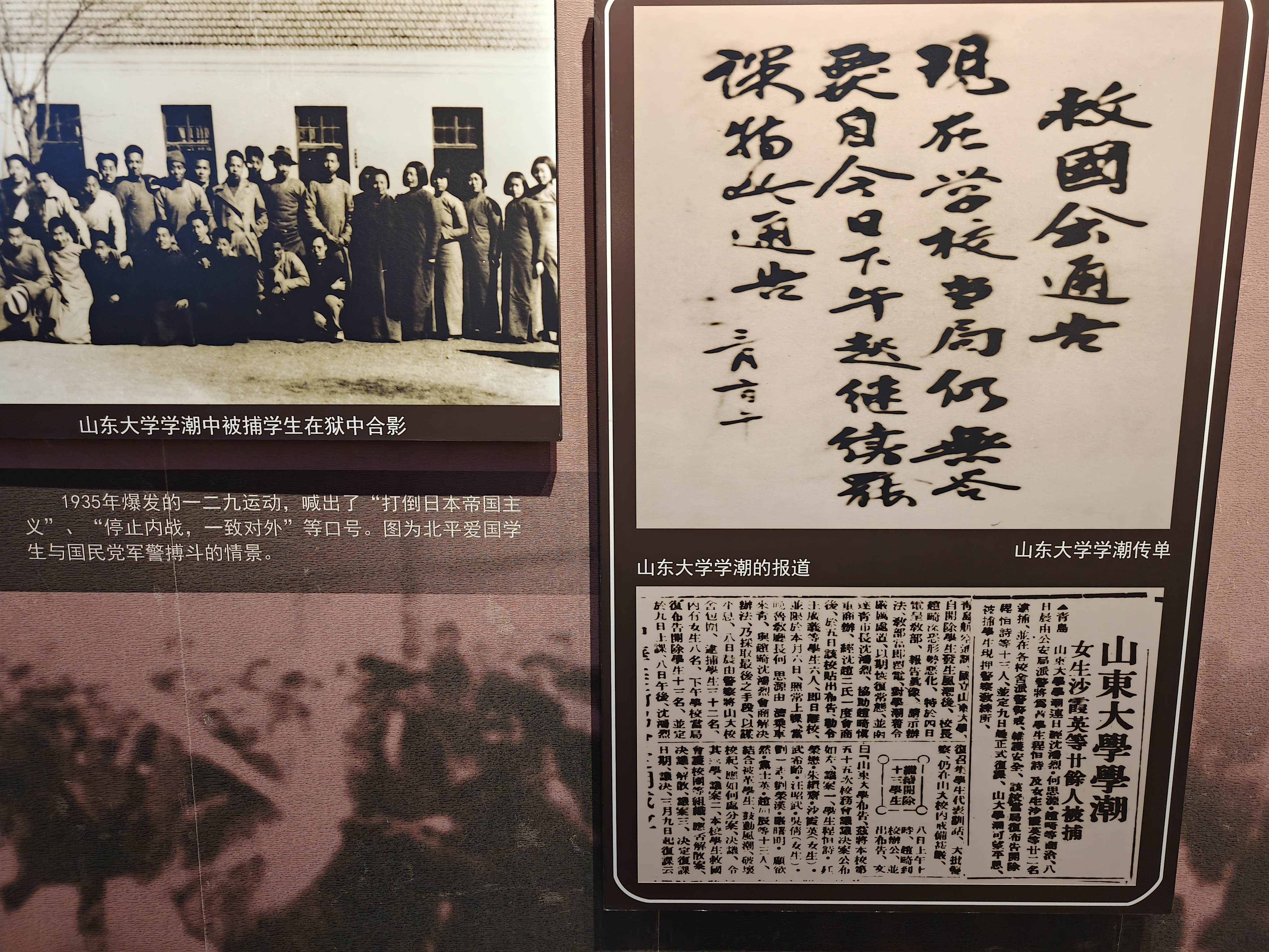 随着历史推进,展览再现了抗战及解放战争时期党组织的发展,展柜中的手雷和“刘胡兰式的英雄”解文卿反抗“还乡团”的壮烈事迹令人动容。在学生运动板块,山大学子抗议美军暴行的声明,连同铁丝网上“反内战 反饥饿 美军滚出去”的巨型标语,深刻传递着昔日青年的浩然正气。