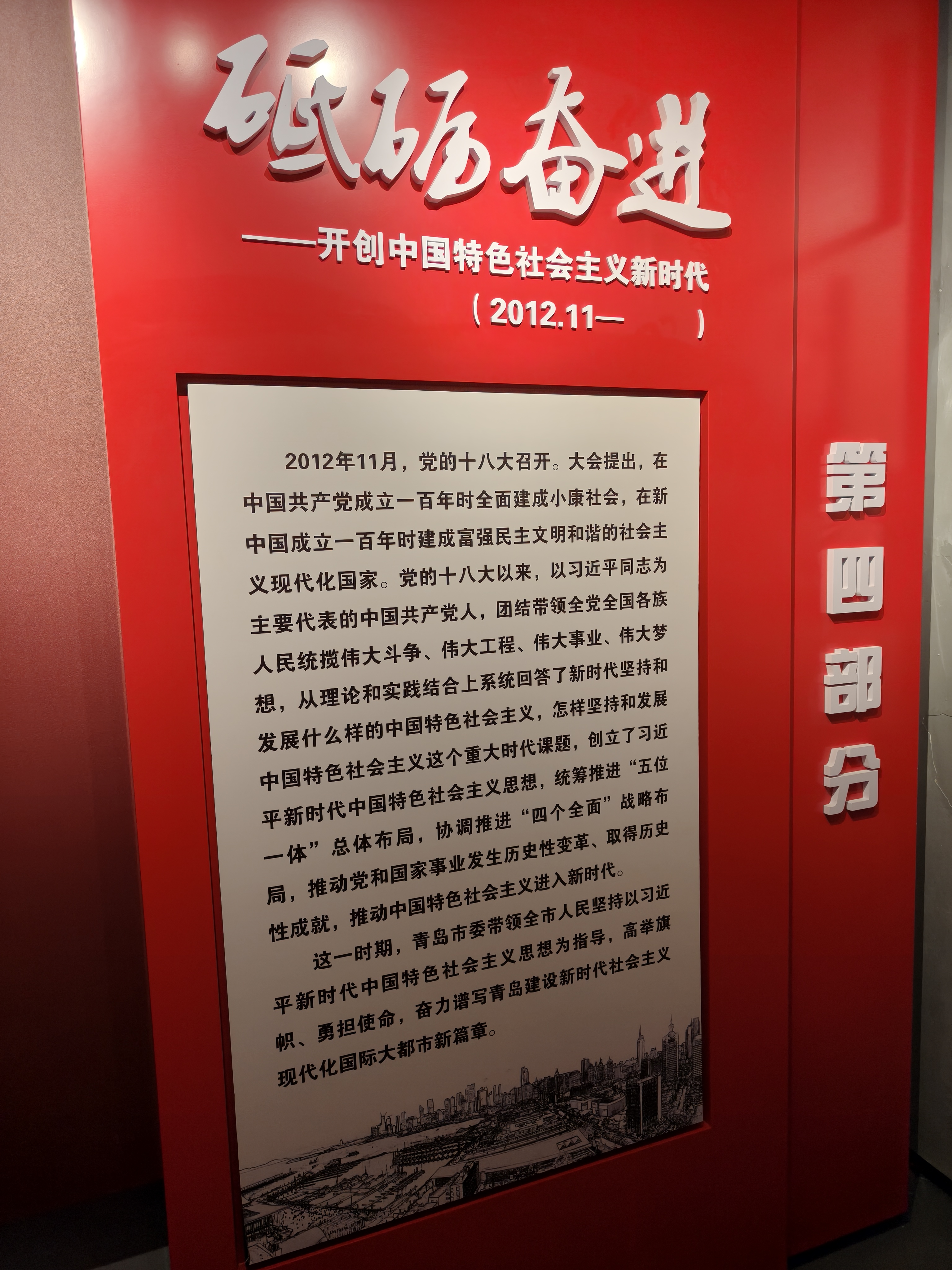 沿着历史脉络,裴一鸣同学走入后续三大展区。第二部分“艰辛探索”与第三部分“波澜壮阔”分别梳理了新中国成立后青岛在推进社会主义建设中的曲折探索,以及党的十一届三中全会后改革开放取得的辉煌成就。其中,1979年《青岛日报》关于“真理标准问题大讨论”的文章极具时代印记。最后,第四部分“砥砺奋进”全景呈现了2012年以来,青岛在开创中国特色社会主义新时代中的宏伟篇章。