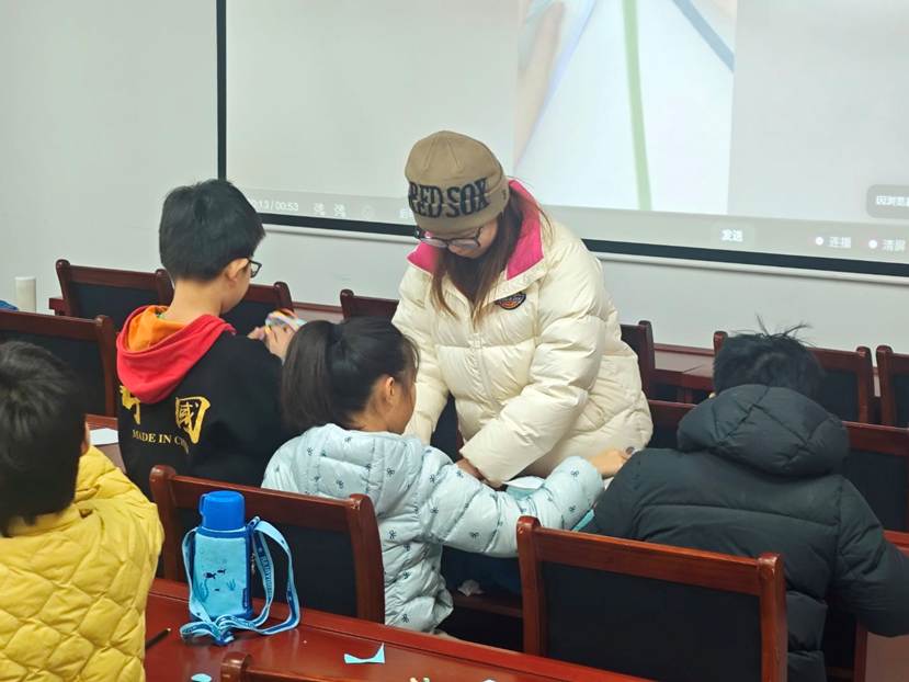 下午,支教成员员高东绪开设了“巧手工坊”课程,带领孩子们用五彩的扭扭棒制作小兔、玫瑰等造型。孩子们在动手过程中相互交流、彼此启发,简单的材料在指尖被赋予了生动的形态。随后,队员们组织观看了纪录片《折纸密码》,通过影片,孩子们了解到折纸艺术背后蕴藏的数学原理及其在现代科技中的应用,拓宽了他们的认知视野。课程最后,高东绪老师还讲解了巨大五角星的折叠原理,帮助孩子们更深入地理解折纸的构造逻辑。