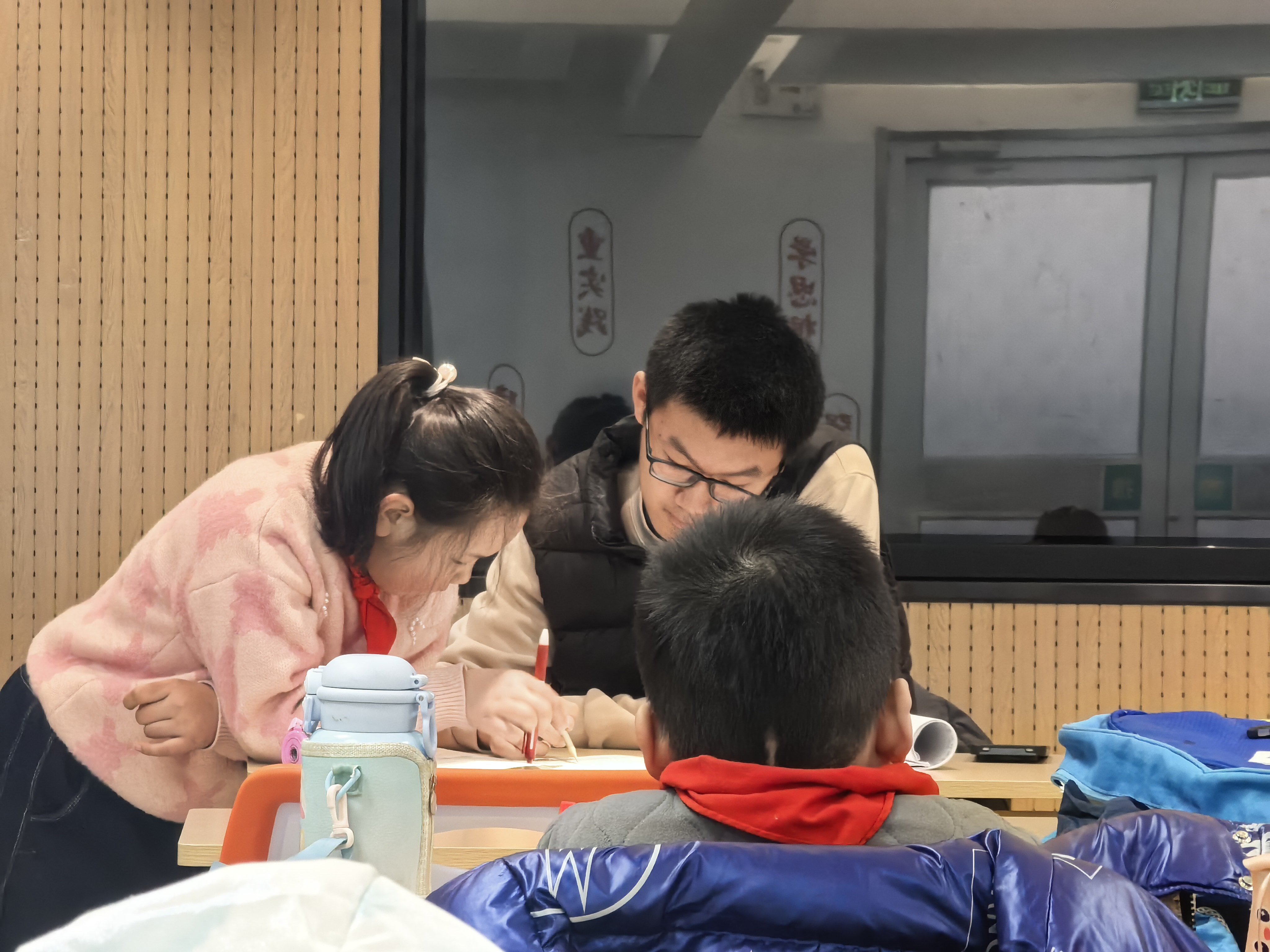2026年1月26日,甸柳新村一区社区教室内学习气氛温馨而专注。山东大学软件学院“泉润育禾支教队”的志愿者们继续在此开展助学活动,面向小学的孩子们,提供语文、数学、英语等学科的作业辅导。志愿者们注重启发与陪伴,不仅帮助孩子解决作业难题,更着力培养他们专注学习的习惯与自主思考的能力。