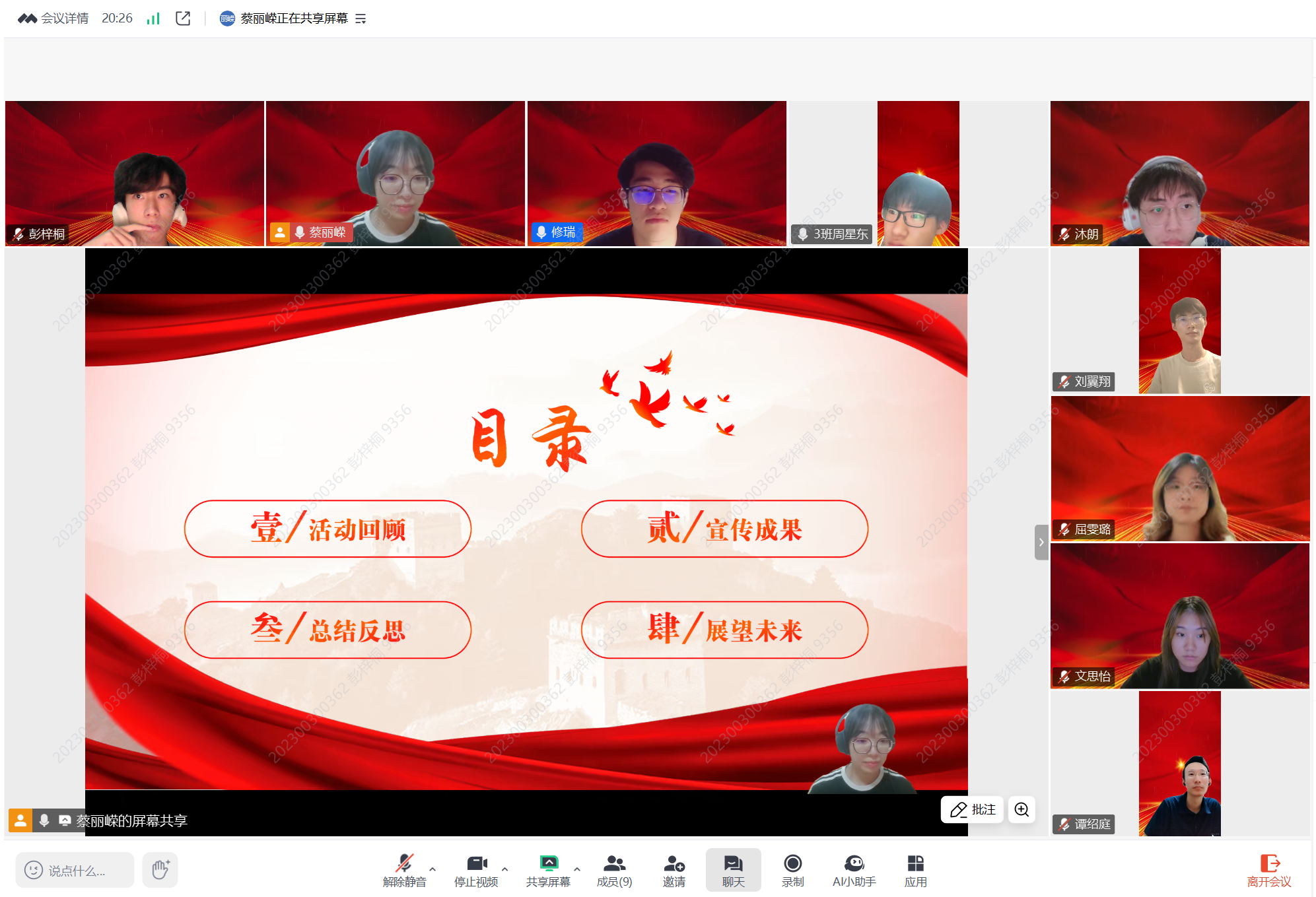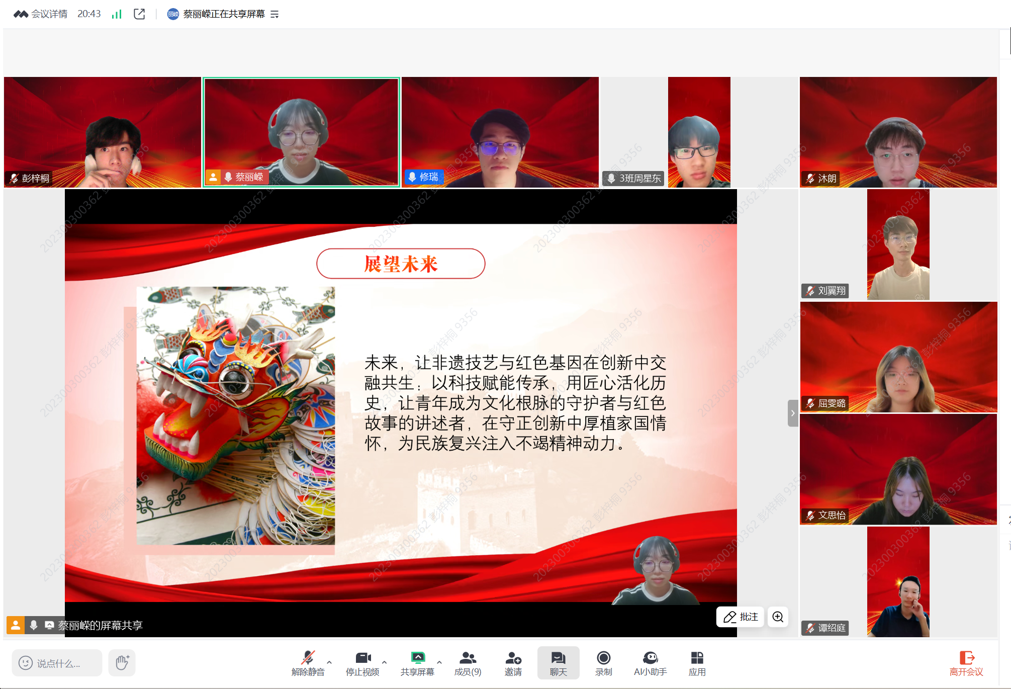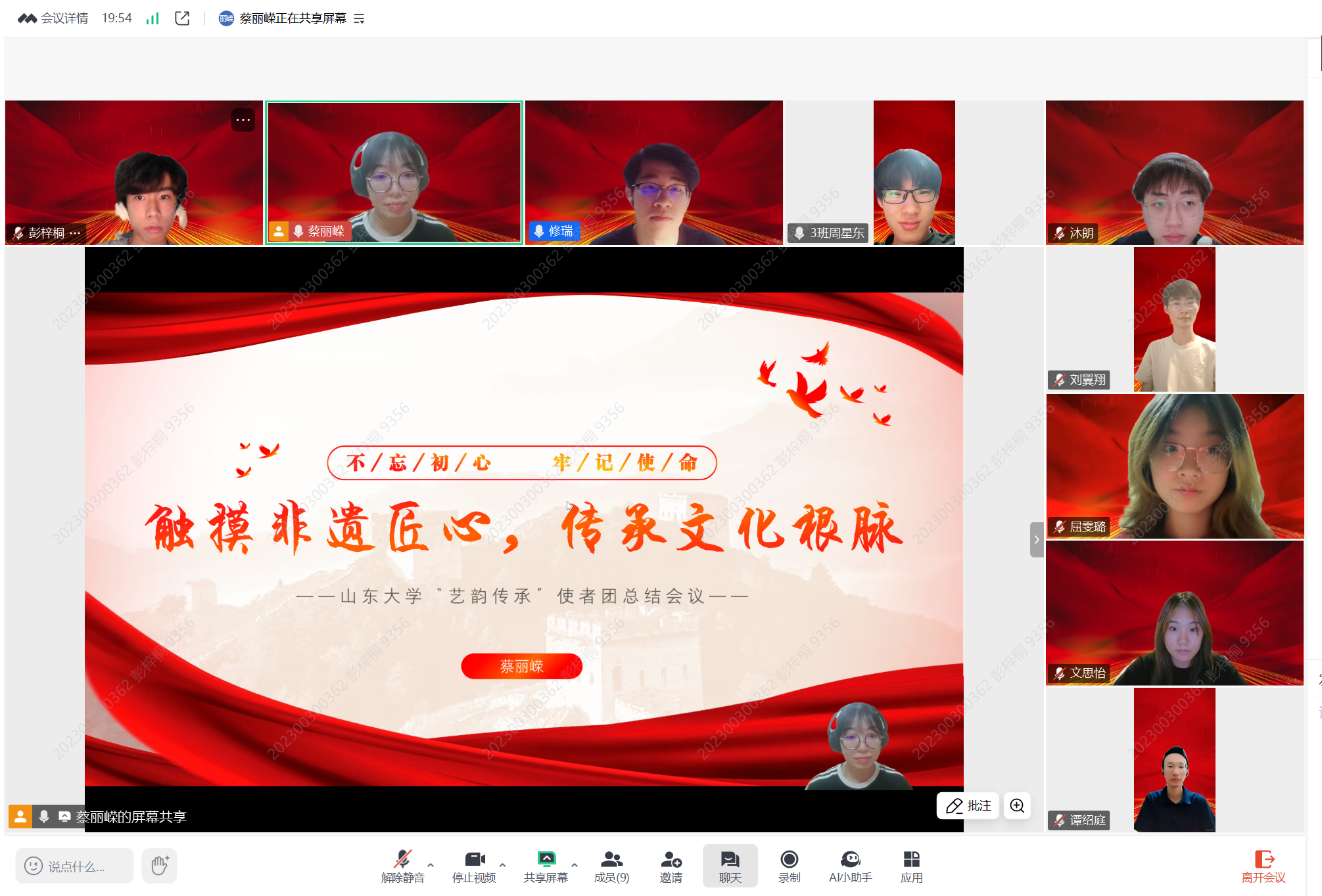 7月31日晚,山东大学艺韵传承使者团通过腾讯会议平台召开“触摸非遗匠心,传承文化根脉”暑期社会实践总结会议。会议回顾实践历程,展示阶段性成果,并规划后续行动计划。团队全体成员在线参会。